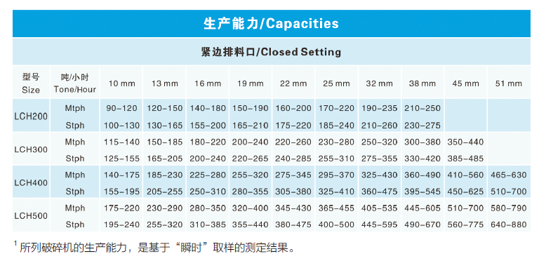 生產(chǎn)能力表可作為LCH 圓錐破碎機(jī)初步選型的工具,表中數(shù)據(jù)適用于松散密度1.6t/m3 的給料、給料中篩出小于排礦口粒級、開路作業(yè)條件下的生產(chǎn)能力。在給料中細(xì)粒級含量較高、閉路作業(yè)條件下,設(shè)備能力比開路作業(yè)高15%- 30%。破碎機(jī)作為生產(chǎn)回路中的一個重要組成部分,其性能的發(fā)揮部分取決于給料機(jī)、皮帶機(jī)、振動篩、支撐結(jié)構(gòu)、電動機(jī)、傳動裝置及料倉等輔件的正確選擇和操作。